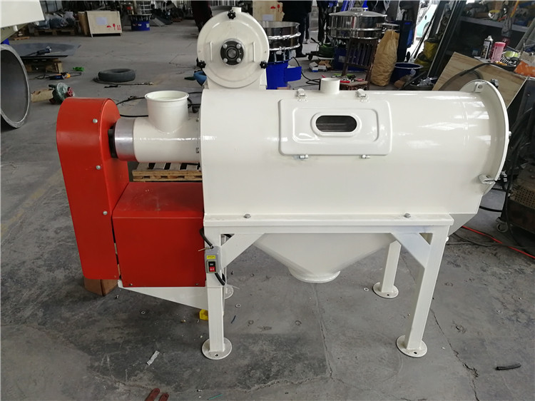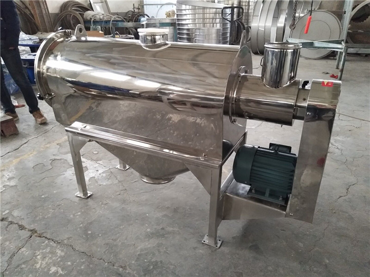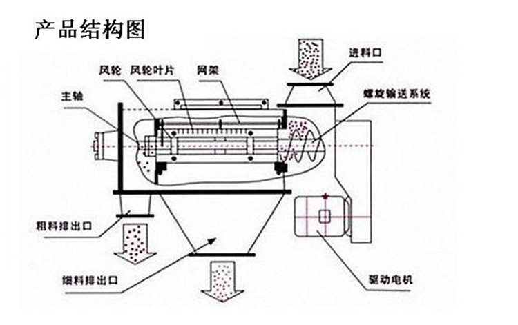 本設(shè)備篩網(wǎng)為圓筒狀,置于機體內(nèi),物料通過螺旋輸送系統(tǒng)后,和氣流混合、霧化進入網(wǎng)筒內(nèi);通過網(wǎng)筒內(nèi)風(fēng)輪葉片使物料同時受離心力和旋風(fēng)推進力,從而迫使物料噴射過網(wǎng),由細(xì)料排出口排出,不能過網(wǎng)的物料沿筒壁從粗料排出口排出。