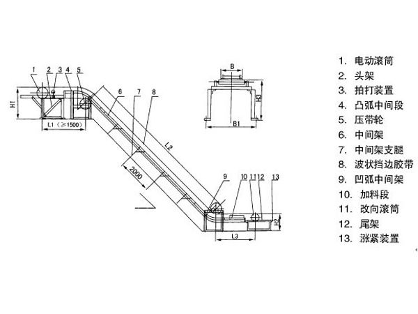 大傾角帶式輸送機(jī)輸送傾角,采用滾筒電機(jī)集中驅(qū)動(dòng),由:電動(dòng)滾筒、頭架、拍打裝置、凸弧中間段、壓帶輪、中間架、中間架支腿、波狀擋邊膠帶、凹弧中間架、加料段、改向滾筒、尾架、漲緊裝置。其結(jié)構(gòu)見(jiàn)圖下圖